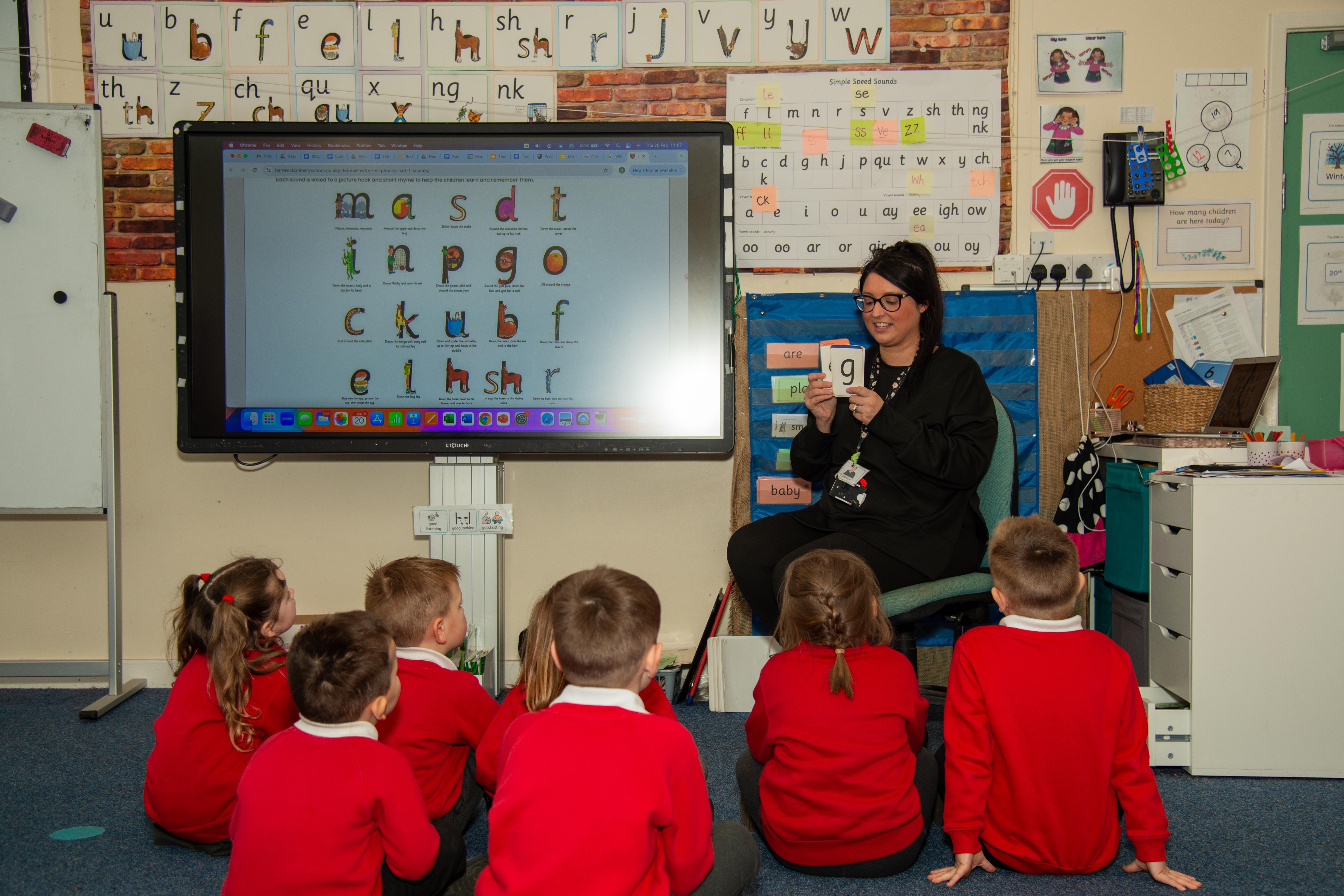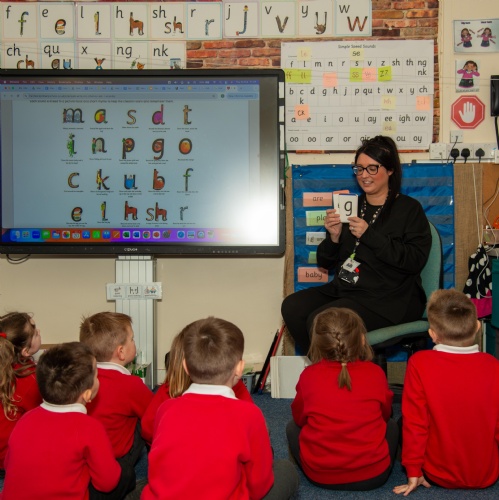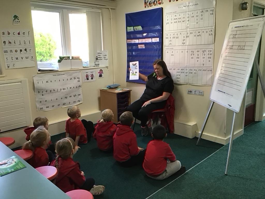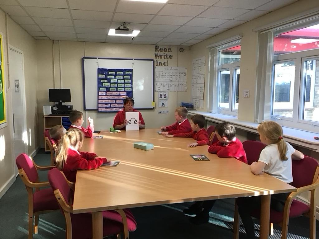Children work in small groups to develop their phonological knowledge. The sessions are interactive and engaging.